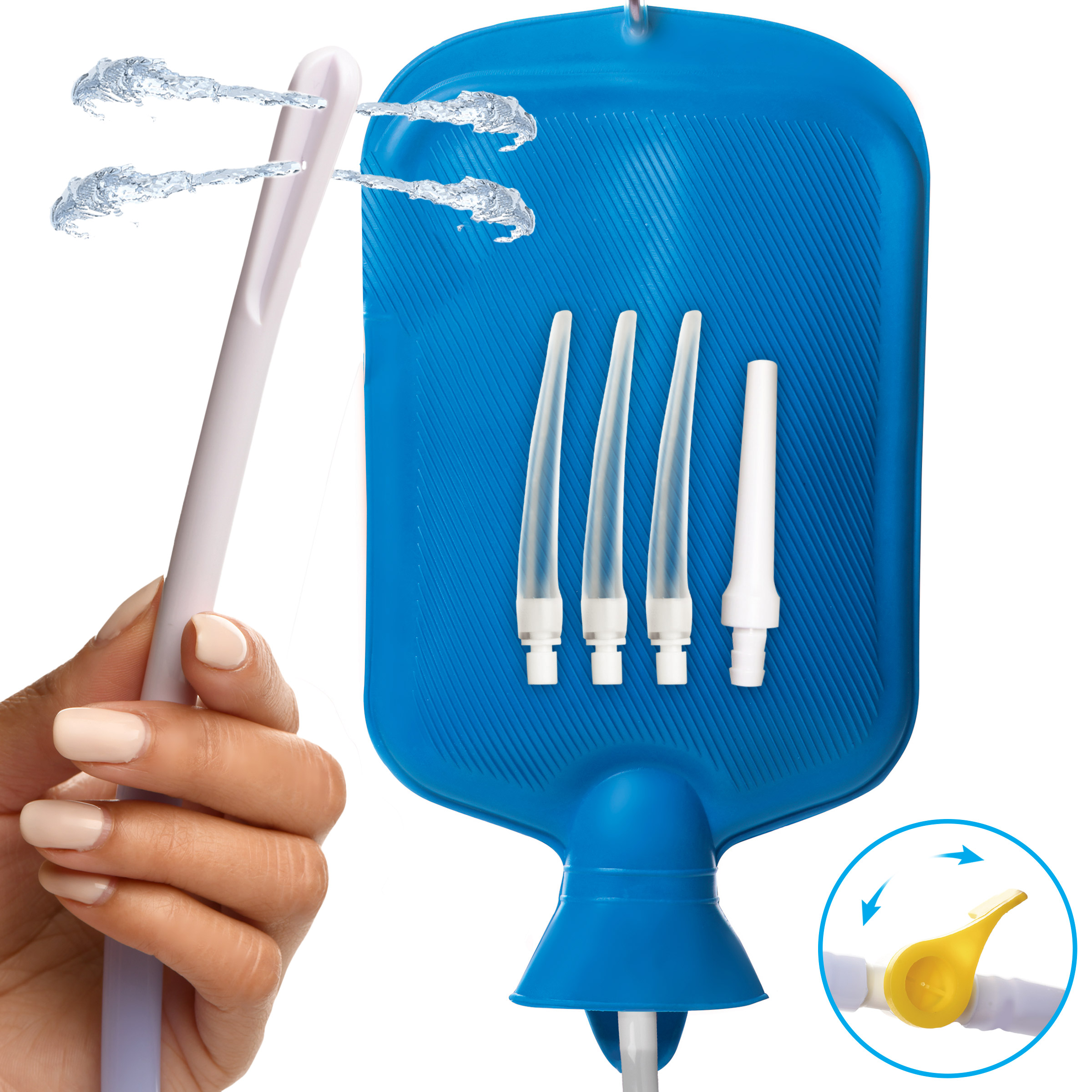 Cleanse your derriere the easy way with this Deluxe Shower Enema Kit! Feel fresher than ever before and enjoy the full feeling you get from lots of liquid adding a delightful pressure inside you. The kit has everything you need to get started and includes one 1.85L enema bag, one 5 foot tubing with flow valve, three flexible tips, one tapered tip, one nozzle tip, one stainless steel hook, one plastic hook, one flow clamp, one stopper, one stopper with tubing adapter. Easily control the water flow with the control valve on the hose so you can slow it down and take it easy as you fill yourself completely. Everyone has their preferences; find out what you like as you explore different tips! Choose between flexible, tapered and nozzle tip. As it hangs above, you can enjoy coffee enemas, salt-water enemas, or simply a warm water cleanse for both health and pleasure! Keep yourself fresh and cleaned out without the hassle and use it in your own shower for both privacy and comfort! All metal used is nickel-free for sensitive skin. Both plastic and rubber are predominantly used so you can safely use a silicone lube to help with smooth, slick insertion. Afterwards, wash it with warm water and soap and let it air dry. Enjoy feeling fresh as often as you like with this easy to use enema kit! Simply put it all together, choose the tip of your preference, and then hang it up and fill it with fluid. The feeling of getting filled up is both vulnerable and exhilarating! It puts pressure on your most sensitive organs while also cooling or warming you up. People have used enemas medicinally, but they can be used for fun as well! If you’ve got a hot date and you intend to let them get deep, deep inside your derriere, an enema is a perfect way to ensure cleanliness! Make sure to allow yourself plenty of time to fully evacuate all the fluid inside after filling yourself up. It can take several trips to the toilet to allow it all to come out. Walk around and let your body move as the fluids move, and stay nearby a toilet for 30 minutes to an hour after a deep, full cleanse. Then you can feel refreshed and ready for a fun night ahead, or simply do it to feel good yourself! Measurements : Bag is 14 inches in length x 7.5 inches wide overall and holds up to 1.85L of liquid. Tubing: 77 inches overall including flow valve tubing (60 inches without flow valve tubing). Flexible tips: 3.5 inches insertable, 0.5 inches widest diameter. Tapered tip: 2.4 inches insertable, 0.5 inches widest diameter. Nozzle tip: 5.1 inches insertable, 0.5 inches widest diameter. Materials : Bag: Rubber Tubing: PVC and PP plastic Tips: PVC and PE plastic Stoppers: ABS plastic Metal hook: Stainless steel and PVC (sleeve) Plastic hook: ABS plastic Flow clamp: POM plastic Color : Blue, white