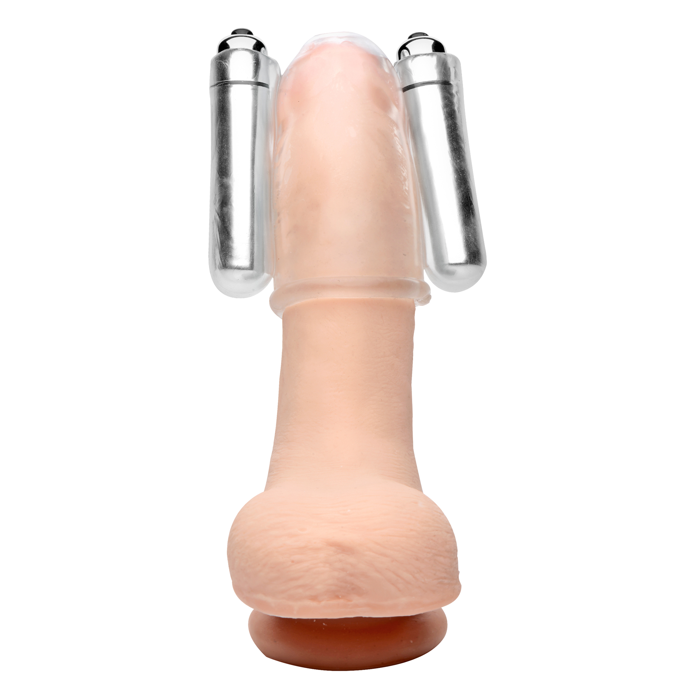 This clear sheath allows you to watch your penis head thrum With super-powered twin vibrating bullets and a super-stretchy, head-encompassing sleeve, you can experience targeted stimulation on one of the most sensitive areas of your body Two ultra powerful wireless bullets help surround the tip of your cock in toe-curling pleasure. Designed to fit most any size, the slick material helps keep the bullets firmly against your helmet, while transmitting the vibration to every part of your cock head. A cum-through hole allows for the ultimate orgasm. Just slip it on and go Measurements: 3.5 inches in length, 1.15 inches in diameter unstretched. Material: TPE, ABS. Color: Clear. Note: Requires 2 AAA batteries, not included.